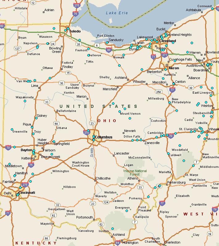Arch Bridge Locations The cyan dots on the Ohio map indicate the state wide distribution of the 128 extant concrete and stone arch bridges listed on this website as of 6/6/2008. Microsoft, Streets and Trips users can download the corresponding map-file for their personal use by left-clicking the map. This file can be zoomed to provide road level detail of the bridge locations and is useful for planning routes to groups of bridges. Maps and directions to individual bridges are accessed in the arch bridges table. Click on a bridge's location entry to link to a Google Map. |